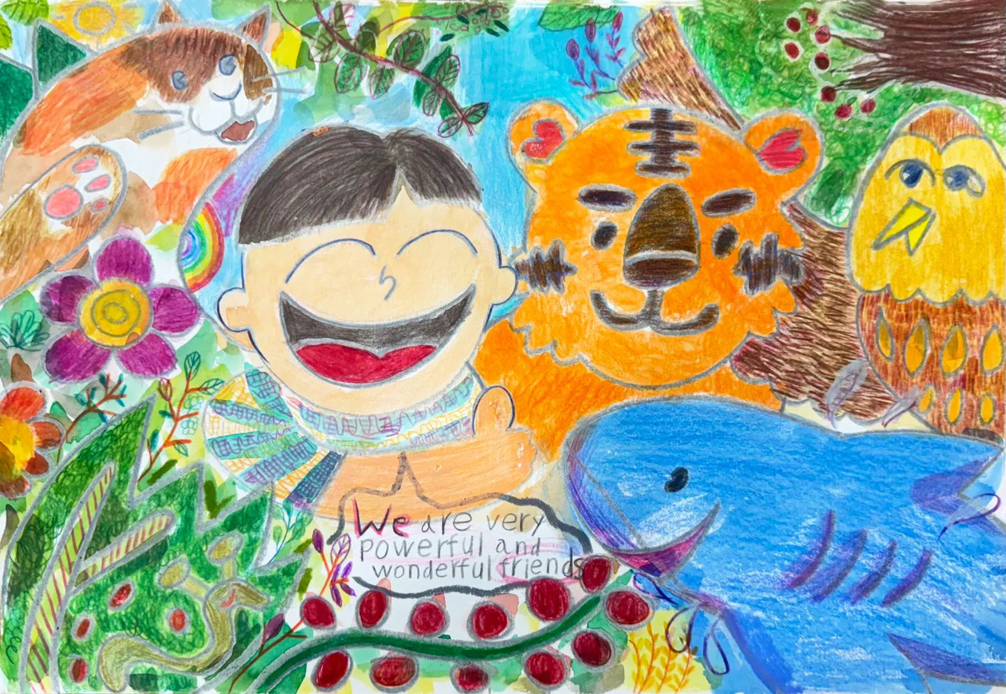 이 그림은 작가와 다양한 동물들이 함께 어울리며 자연 속에서 행복한 순간을 표현하고 있습니다. 중심에는 활짝 웃고 있는 작가가 그려져 있으며, 그의 양옆에는 호랑이, 상어, 올빼미와 같은 동물 친구들이 있습니다. 호랑이는 오렌지빛 털과 강렬한 줄무늬를 가지고 있으며, 상어는 파란 바다를 연상시키는 선명한 색깔로 생동감 있게 표현되었습니다. 올빼미는 황갈색의 깃털과 독특한 눈모양으로 지혜로움을 상징합니다. 작가의 왼쪽에는 귀여운 고양이가 편안히 앉아있고, 그림 곳곳에는 생명력 넘치는 꽃과 나무가 풍성하게 자리잡고 있습니다. 초록의 잎사귀와 형형색색의 꽃들이 자연의 아름다움을 강조하며, 나뭇가지에는 새싹과 열매들이 생동감 있게 묘사되었습니다. 하단에는 "We are very powerful and wonderful friends"라는 문구가 적혀 있어, 작가와 동물들, 그리고 자연이 하나로 연결된 돈독한 관계를 상징합니다. 이 그림은 자연과 동물, 그리고 사람 사이의 조화로운 관계와 평화를 강조하며, 모두가 하나로 어우러져 행복한 세상을 표현하고 있습니다.
