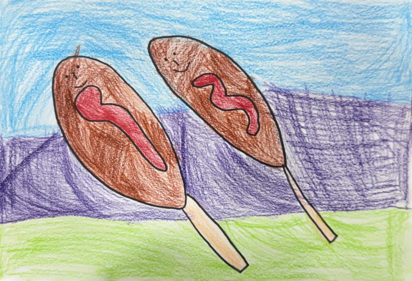 이 그림은 막대 아이스크림 두 개를 귀엽게 의인화한 모습이 담겨 있습니다. 아이스크림은 브라운 초콜릿 색으로 그려졌으며, 각각의 표면에는 밝은 빨간색으로 표현된 하트와 구불구불한 모양이 장식되어 있습니다. 아이스크림들은 웃는 얼굴로 그려져 있어, 행복하고 즐거운 분위기를 전달합니다. 배경은 하늘색과 보라색, 초록색으로 층층이 구성되어 있습니다. 이러한 배경은 아이스크림의 밝은 색상과 대비를 이루며 그림에 생동감을 더해줍니다. 이 작품은 단순한 아이스크림을 통해 생동감과 즐거움을 표현하며, 따뜻한 날씨에 즐기는 소소한 행복을 잘 담아내고 있습니다.