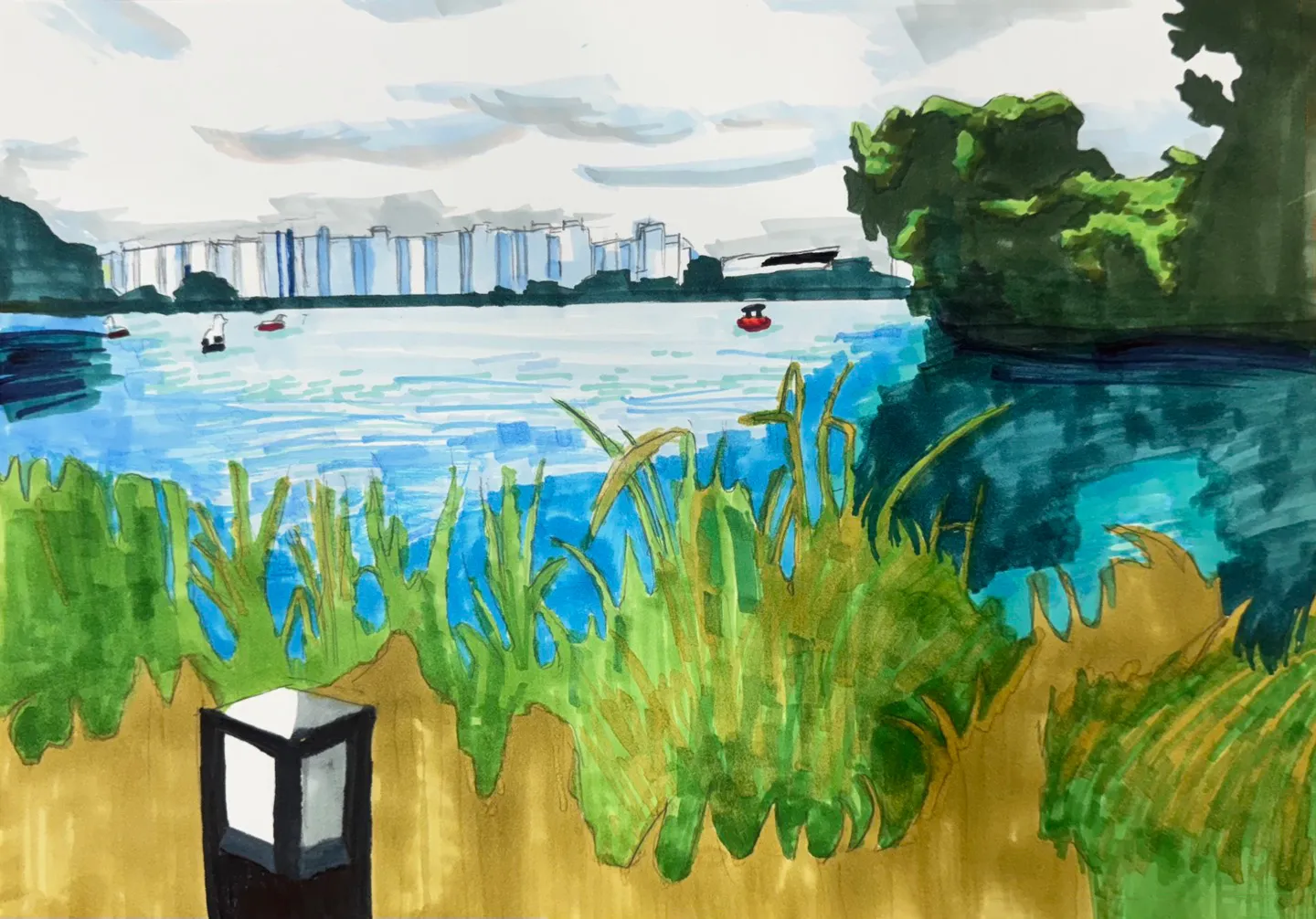 이 그림은 호숫가의 평화로운 풍경을 담고 있습니다. 그림의 전면에는 푸르고 싱그러운 풀들이 자리하고 있으며, 풀 사이로 작은 가로등이 보입니다. 가로등은 어두운 색상으로 표현되어 자연의 초록빛과 대비를 이루고 있습니다. 호수는 맑고 푸른 물결로 그려져 있으며, 잔잔한 물 위에는 작은 보트들이 떠 있습니다. 보트는 흰색과 빨간색으로 채색되어 호수 위의 고요함을 더욱 돋보이게 합니다. 멀리 보이는 배경에는 하늘을 배경으로 고층 아파트와 나무가 자리하고 있으며, 구름이 낀 하늘은 청량하면서도 차분한 느낌을 줍니다. 이 작품은 도시와 자연이 조화를 이루는 모습을 담아내어, 일상 속에서 누릴 수 있는 평온함과 아름다움을 잘 표현하고 있습니다.