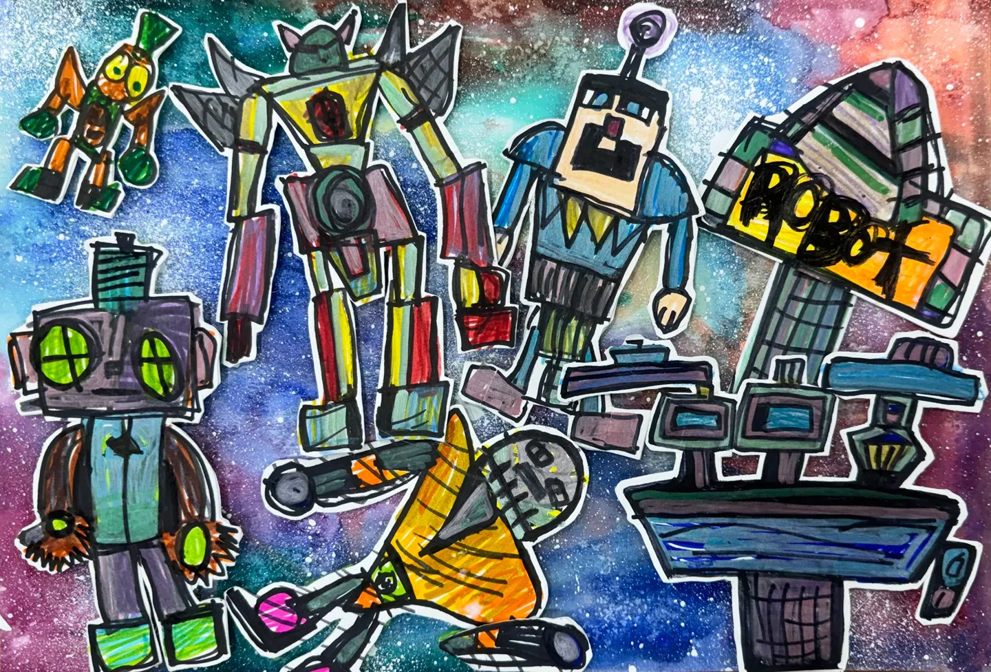 이 그림은 우주를 배경으로 다양한 로봇들이 등장하는 독창적인 작품입니다. 배경은 은하수가 흐르는 듯한 느낌의 푸른색과 자줏빛으로, 별들이 반짝이며 신비로운 분위기를 연출합니다. 로봇들은 각기 다른 색상과 형태로 표현되어 있으며, 각자의 개성을 뽐내고 있습니다. 왼쪽에는 초록색 눈과 날개 모양 팔을 가진 작은 로봇이 있으며, 중앙에는 커다란 몸체와 날개 같은 장치를 가진 강력한 로봇이 서 있습니다. 오른쪽에는 안테나를 가진 로봇과 "ROBOT"이라고 쓰인 구조물이 있어 이야기를 더욱 풍성하게 만듭니다. 아래쪽에는 드릴 형태의 팔을 가진 특이한 로봇이 등장하여 작품에 독특함을 더합니다. 전체적으로 화려한 색감과 독창적인 디자인이 돋보이며, 우주 속 로봇들의 모험을 상상하게 만드는 흥미로운 그림입니다.