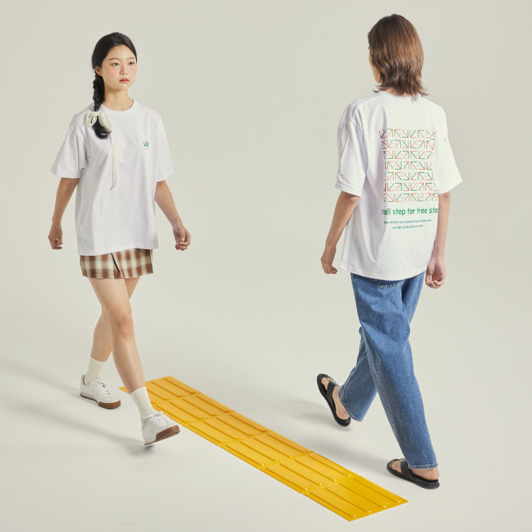 시각 장애인의 이동권 보장을 위한 일환으로, 점자 블록 시스템 개선에 대한 염원을 담은 티셔츠입니다. 점자 블록을 도식화한 패턴과 'small step for free step'이라는 메세지를 함께 담아 제작하였습니다.